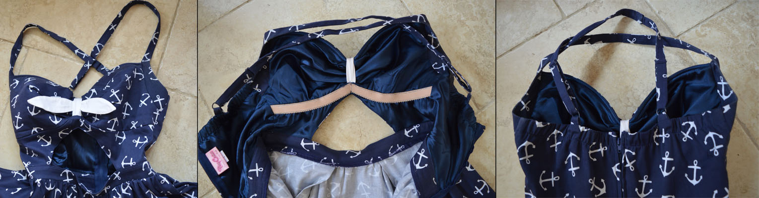 This dress showcases the area I’m most self conscious about, but I loved this dress from the moment I saw it. Anchors? A Jenny skirt? Pockets? White and navy colour scheme? Cute bust detail? Those are all my favourite things! And yet I intensely wavered back and forth about buying it because I wasn’t sure about that damn cut-out. I had even been given the money to buy it from friends and family as a birthday gift and I still wasn’t sure. I’m a PUG L typically but at the time since this dress was a new release there were no reviews and I had worries that the L wouldn’t even zip up, let alone the chance that it might provide unflattering tummy pooch. Even if it fit I was worried it might look okay but that I would never have the courage to wear it. I mentally made back-up plans that if I got it and felt too self-conscious about the cut-out then I could either partially cover it with a belt, or else wear a white top underneath that was visible in no way except through the cut-out, and maybe that would look like it was just part of the dress…? On and on I pondered and swayed, circled and fretted.