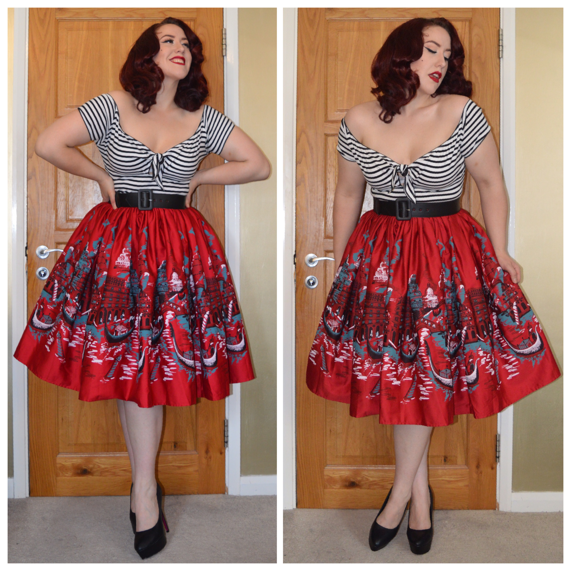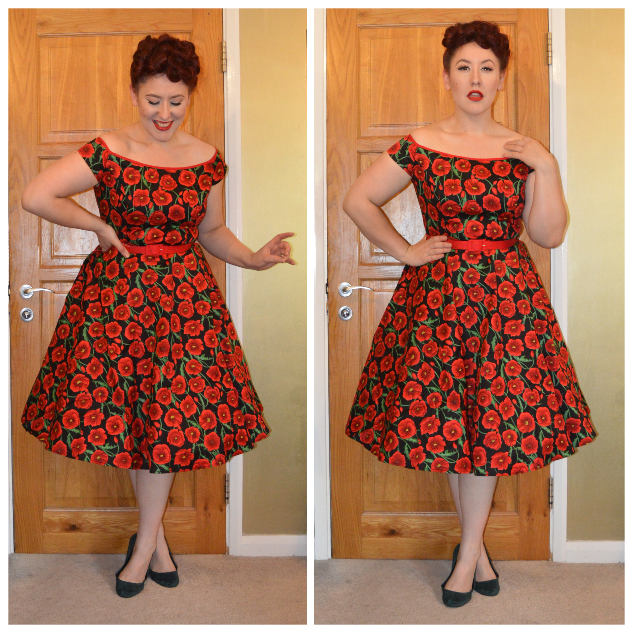 Voodoo Vixen Joni dress without it’s belt (now available in plus size) and everything5pounds.com red velour peeptoe heels