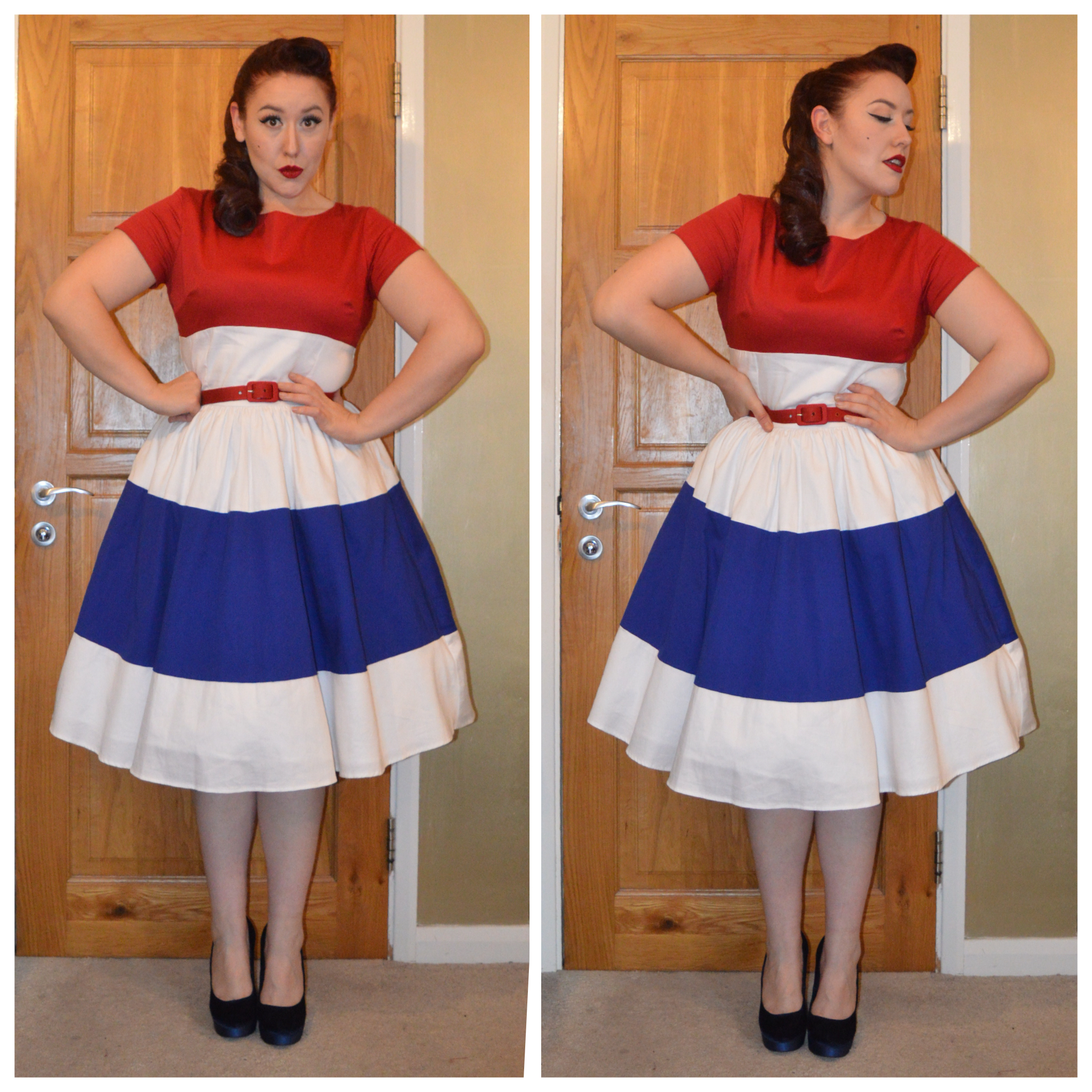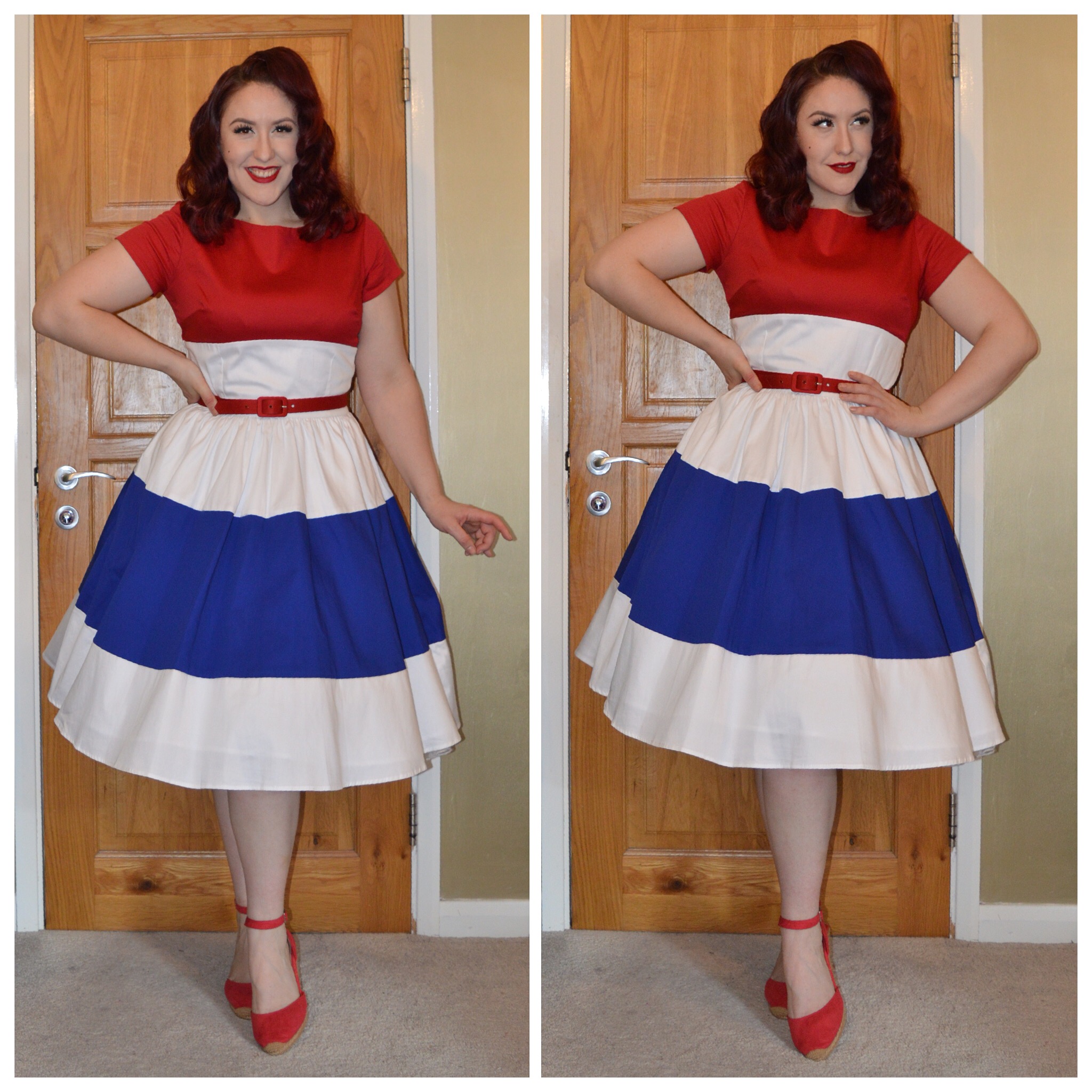 Outfit repeater! Pinup Girl Clothing Red, White & Blue Amanda dress with matching belt, Tesco F&F Red Espadrille wedges