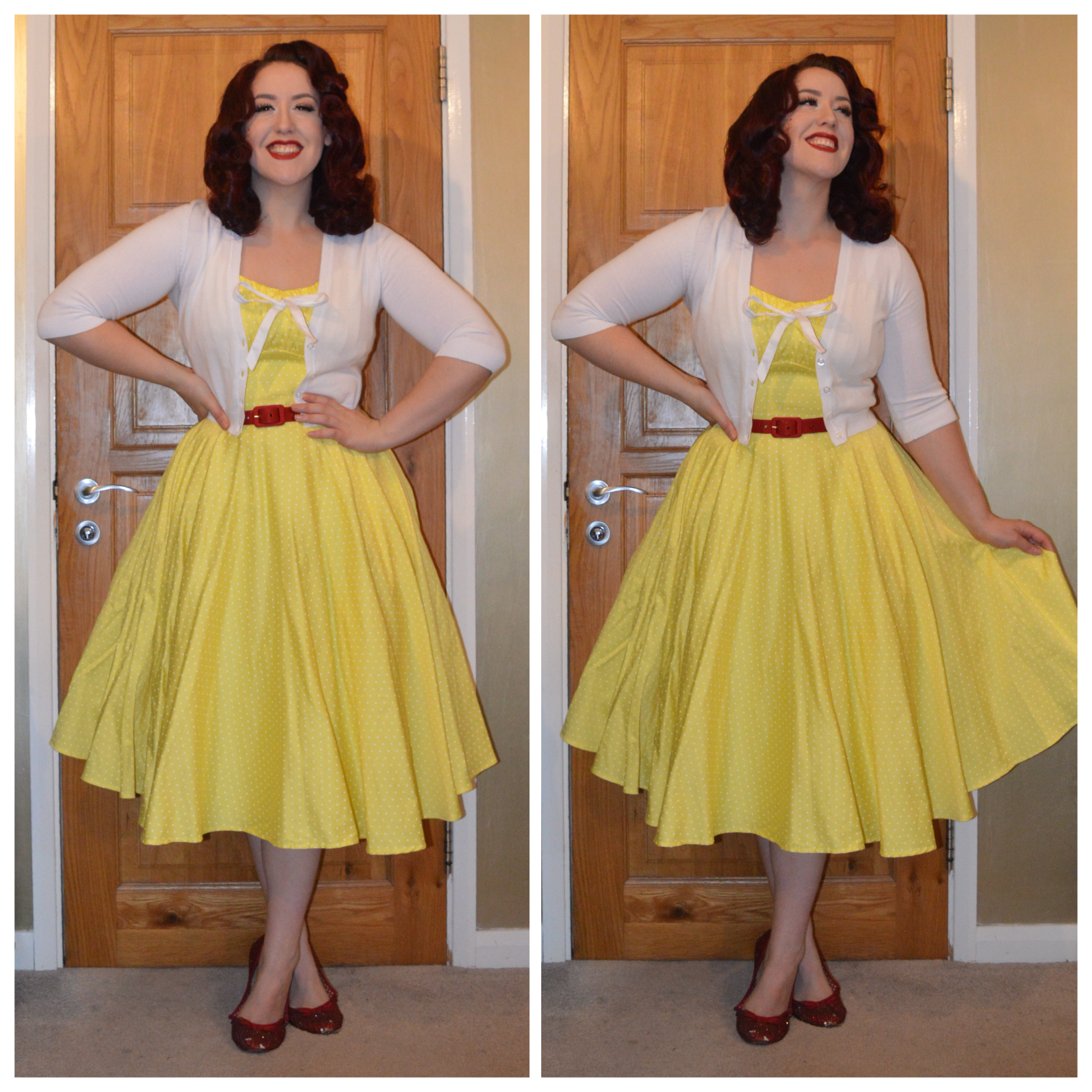 Pinup Girl Clothing Yellow Molly dress, New Look white cropped cardigan, PUG Red Sateen grommet belt, hand bedazzled ballet flats