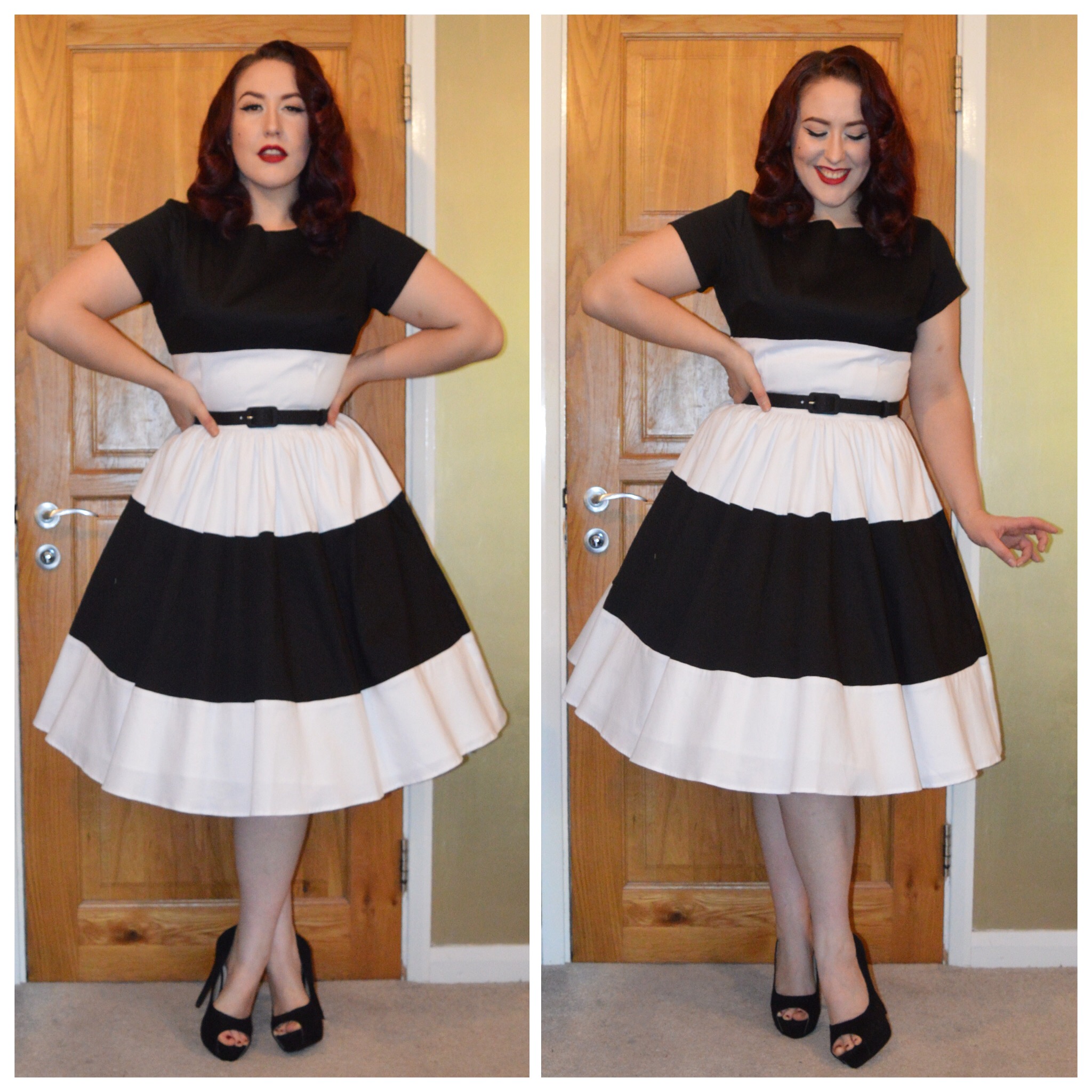 Pinup Girl Clothing Black & White Amanda dress with belt, everything5pounds.com black peeptoe velour heels