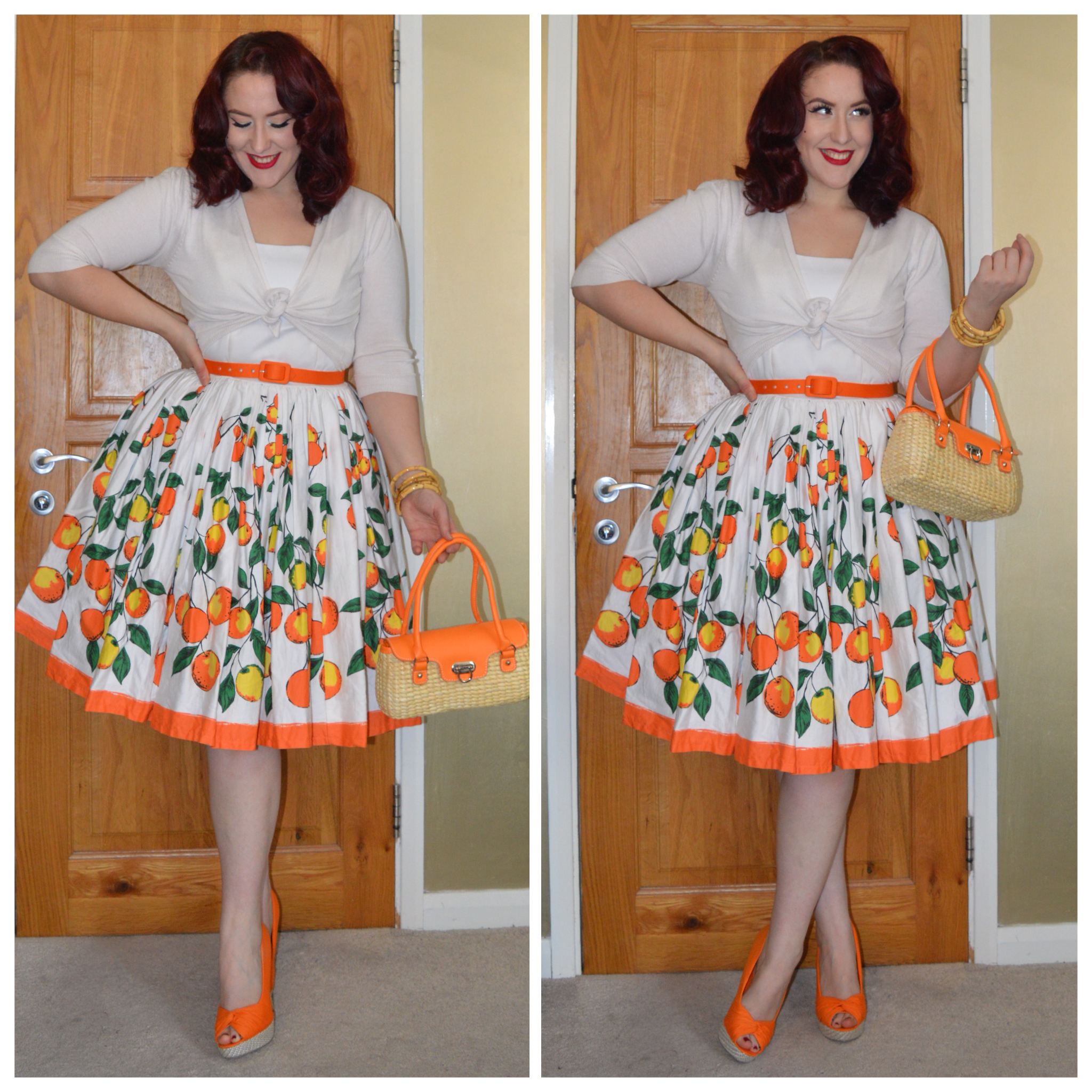 Pinup Girl Clothing Orange Border print Jenny dress with matching belt, PUG 6 pack bamboo bangles, Primark white cardigan, everything5pounds.com heels, Tatyana Orange braided purse