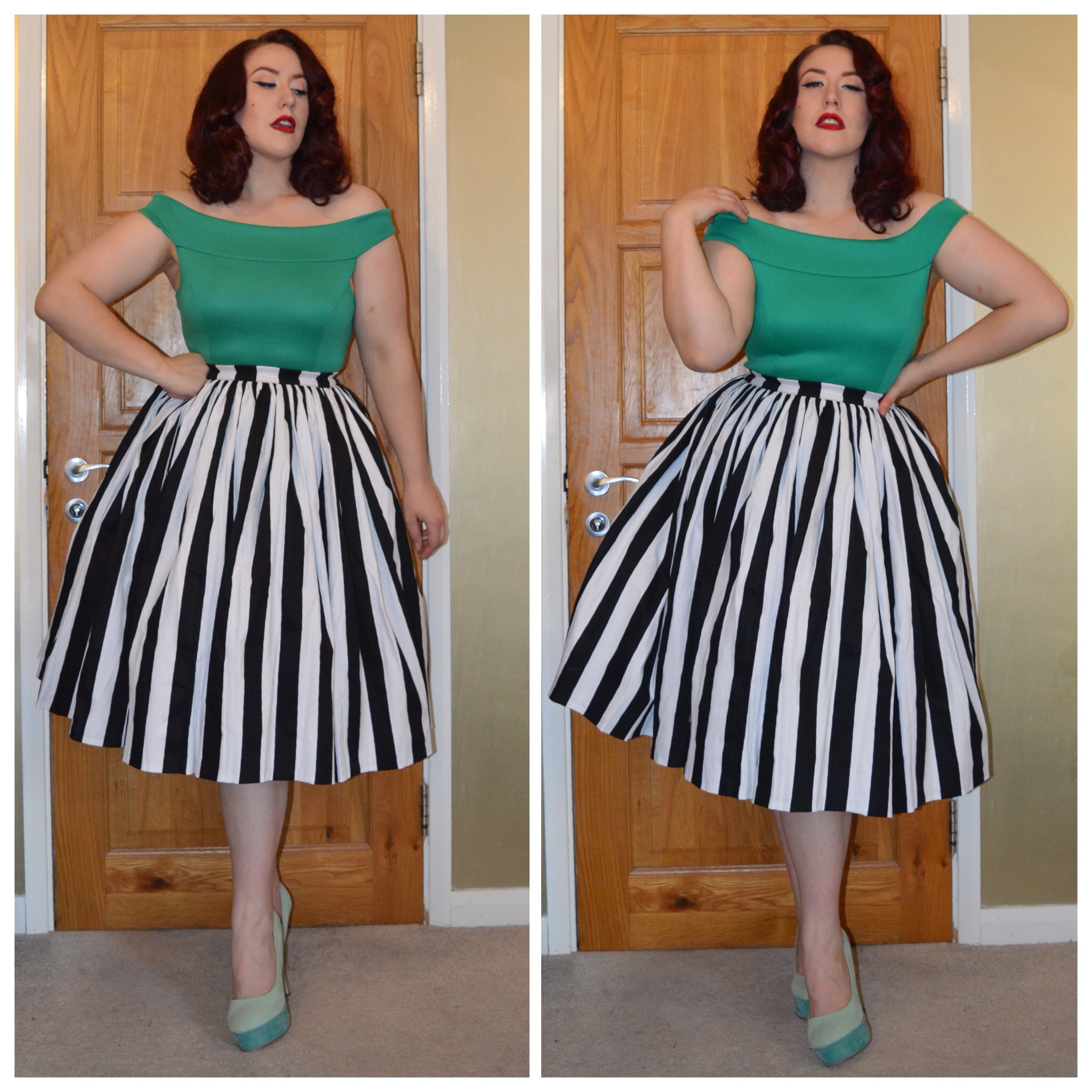 Pinup Girl Clothing Gothic Capsule Collection Black & White striped Jenny skirt, eBay jade green bardot top, Truffle mint heels