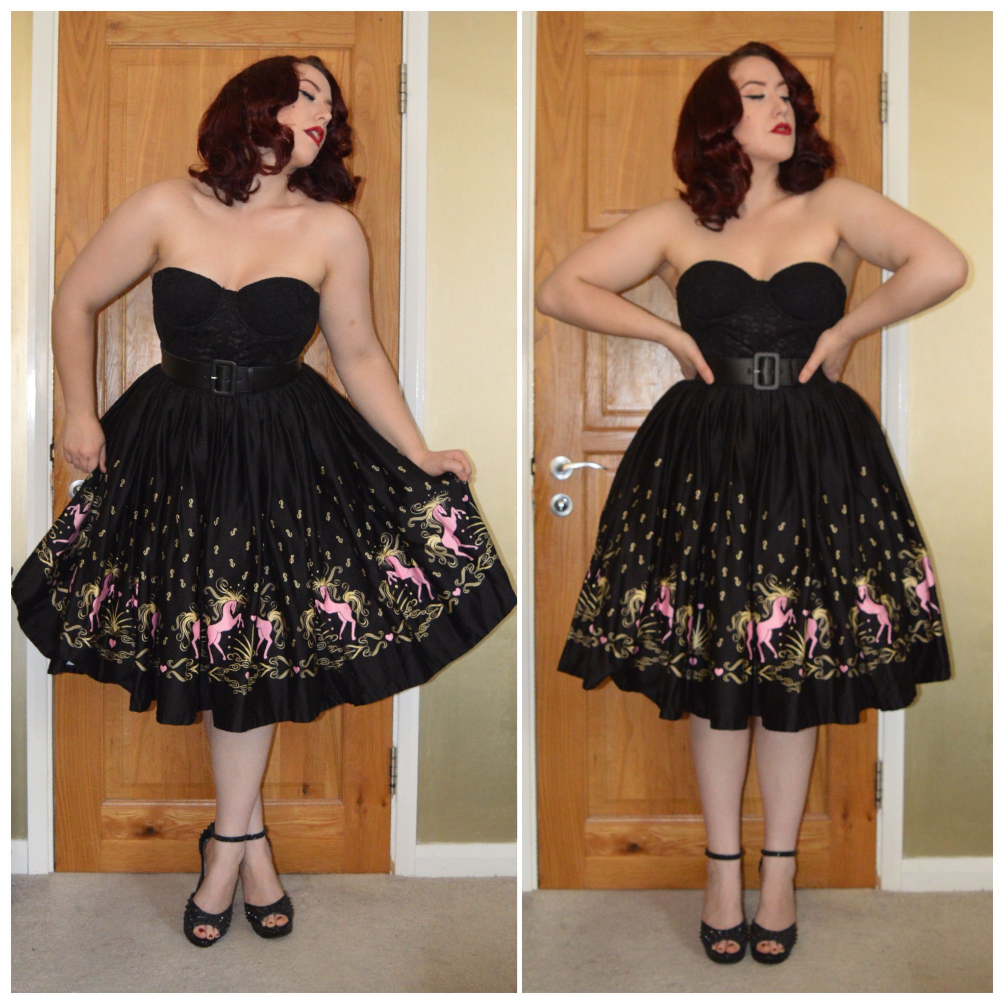 Pinup Girl Clothing Dancing Horses print Jenny skirt, PUG Faux leather belt, ASOS low back bustier bra, eBay spiked heels