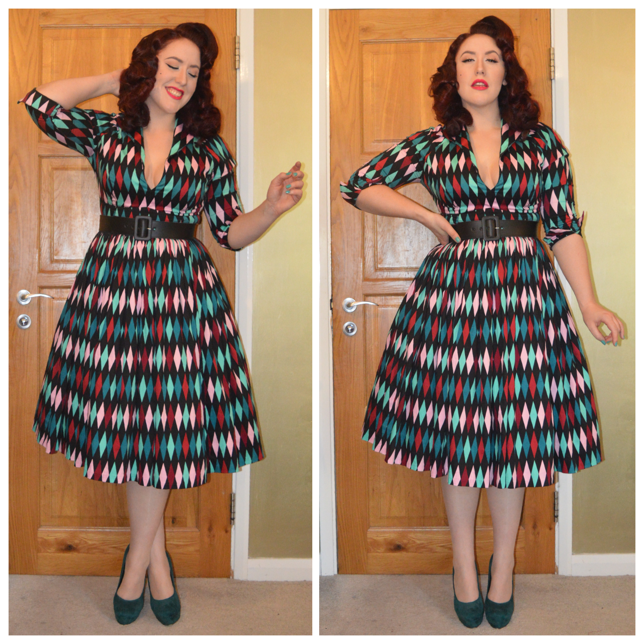 Discontinued Black & Turquoise Harlequin print Pinup Girl Clothing Jenny skirt and Lauren top, PUG black faux leather grommit belt, everything5pounds.com heels