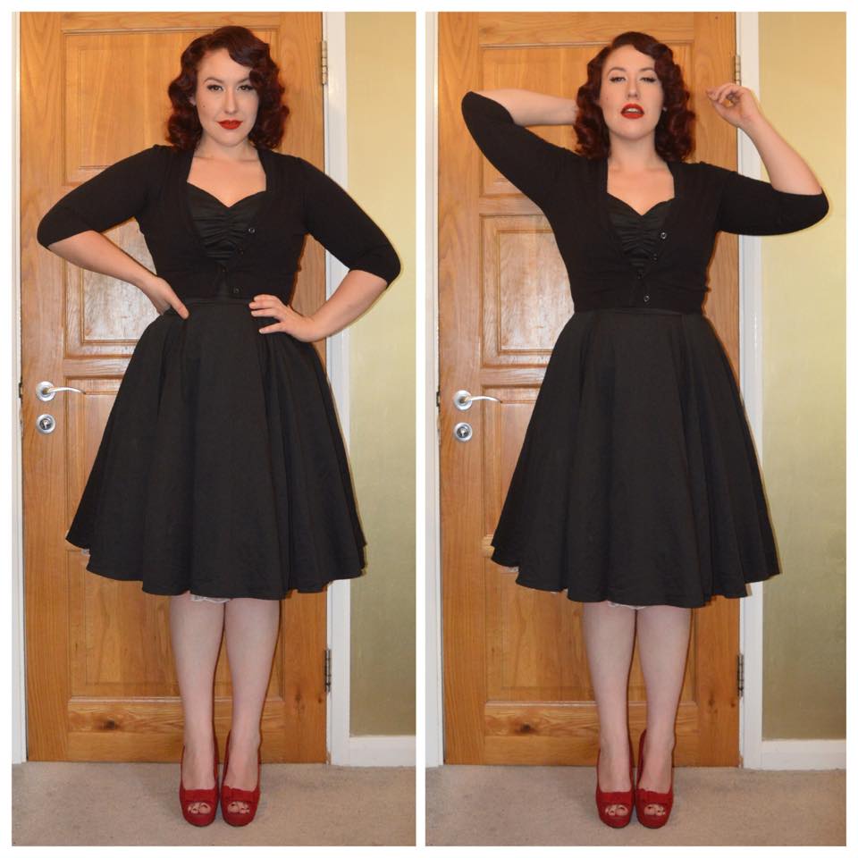 Doll Me Up Darling Black Evening dress, New Look black cropped cardigan, everything5pounds.com red velour peeptoe heels