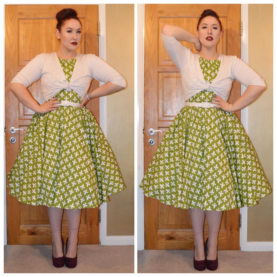 Pinup Girl Clothing discontinued Olive & White Fleur De Lis Harley dress & belt, Primark cropped cardigan, old season Primark plum heels