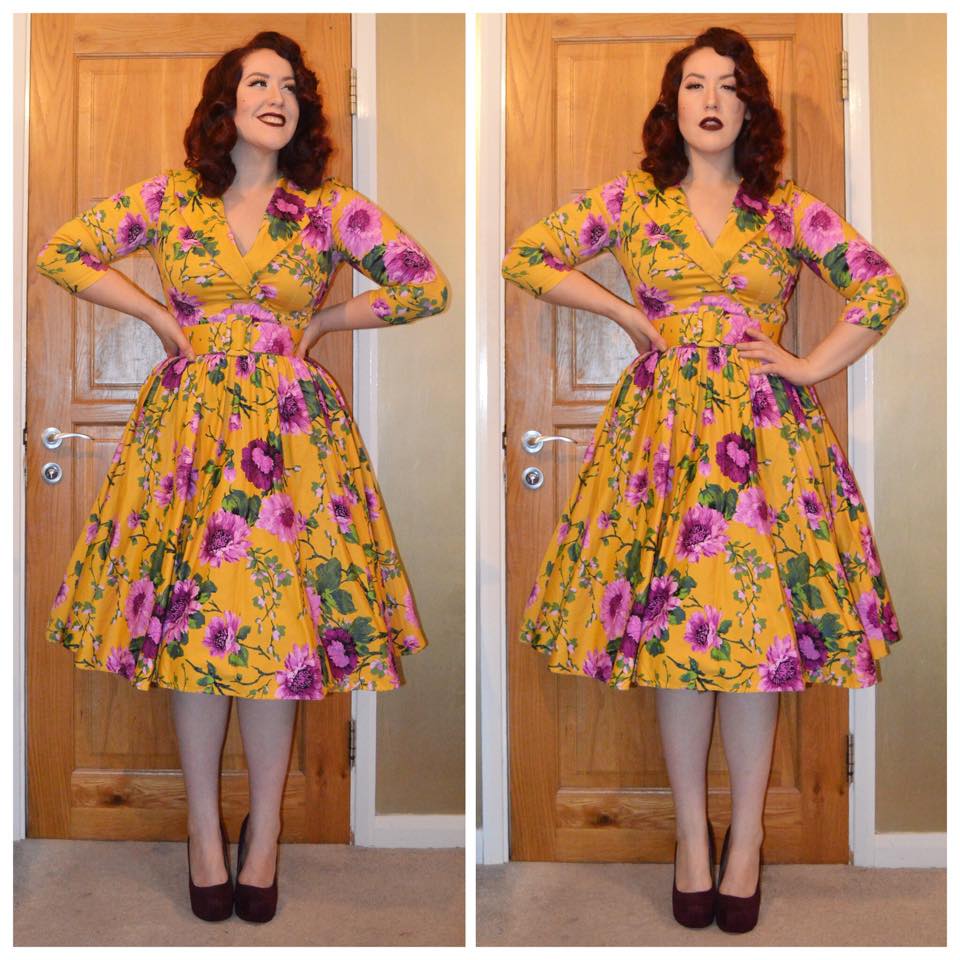 Pinup Girl Clothing Mustard & Purple Birdie dress, olf season Primark plum heels