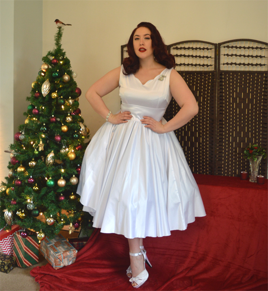 The Brenda dress by Queen of Heartz is one of their staple dresses they’ve made in multiple colourways over the seasons. Their Ivory sateen colourway immediately struck me as a beautifully simple and classic option for a vintage style wedding dress, particularly for ladies who are on a budget. It would also be a lovely White Christmas option for a party dress, and it was with that in mind that I shot this dress as part of this party dress series, sticking with the white and only adding silver in my accessories like this outfit was all frost and snow.