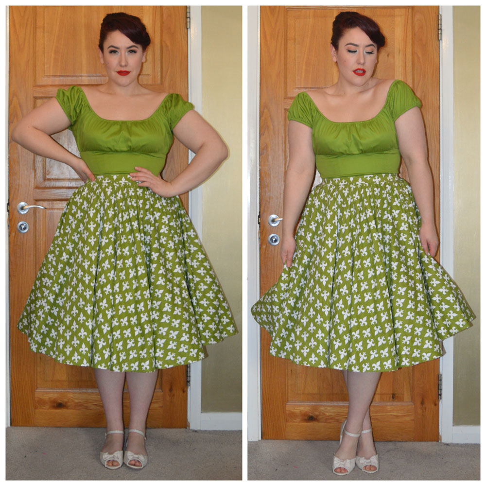 Olive Green Peasant Top by Pinup Girl Clothing, Discontinued Olive & White Fleur De Lis Harley dress worn as a skirt by Pinup girl Clothing, old season Primark flats