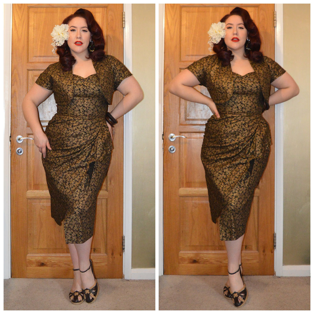 Venice print Christie dress by Lindy Bop, Mustard Cropped Cardigan from Pinup Girl Clothing, old season Truffle heels, Crystal hairclip from Tegen Accessories