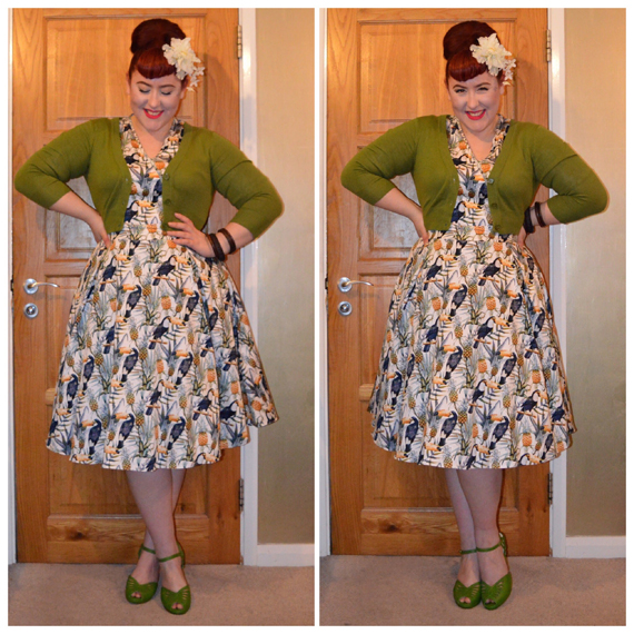 Toucan Print Estella dress by Lady Voluptuous, Sage Tootsie Cropped Cardigan from Doll Me Up, Green Loraine heels by BAIT, old bangles, Ivory Blossom Falls hair flower by Alternate Normality, Deluxe clip In Bettie Bangs by Classy Rebel