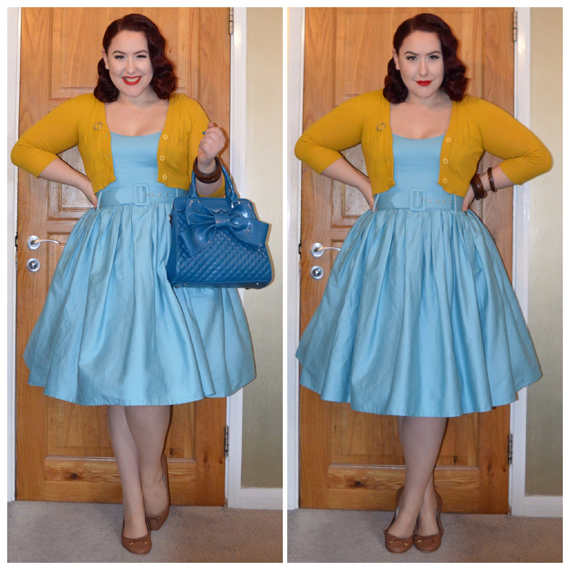 Blue Jade dress by Collectif, Honey Tootsie Cropped Cardigan from Doll Me Up, Wrapped in a Bow bag by Voodoo Vixen, old Primark flats, old ASOS circle brooch, old bangles