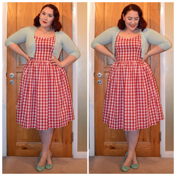 Red Gingham Lucy cardigan from Collectif, Marilyn dress by Blueberry Hill Fashion, old F&F flats, Deluxe Clip In Bettie Bangs by Classy Rebel