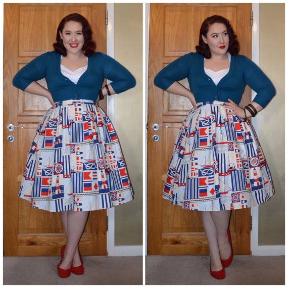 50s Lighthouse skirt by Hell Bunny, Teal Tootsie Cropped Cardigan from Doll Me Up, Miss Candyfloss top, old F&F flats, Splendette dark woven bangle, old wooden bangles