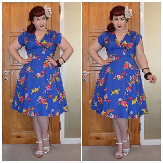Amber dress by Voodoo Vixen, Felicity orchid hairclip by Daisy Jean Florals, Deluxe Clip In Bettie Bangs by Classy Rebel, Splendette dark woven bangle, old wooden bangles, old F&F wedges