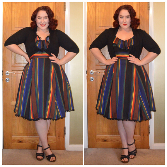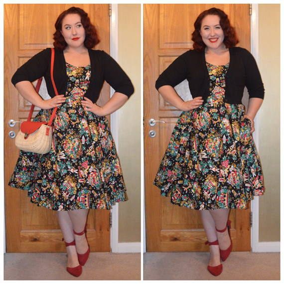Adelyn dress by Voodoo Vixen, New Look Black cropped cardigan, old Black clog sandals