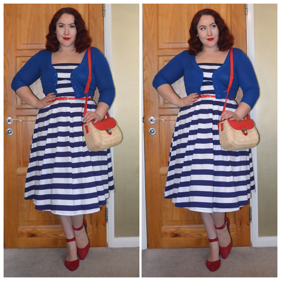 Lana dress by Dolly & Dotty, Royal Blue Tootsie Cropped Cardigan from Doll Me Up, Emmy basket bag by Joanie clothing, New look red tie flats
