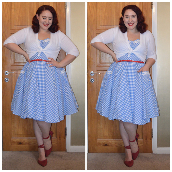 Blue gingham Corinna dress, New Look White cropped cardigan, old belt, New Look red tie flats