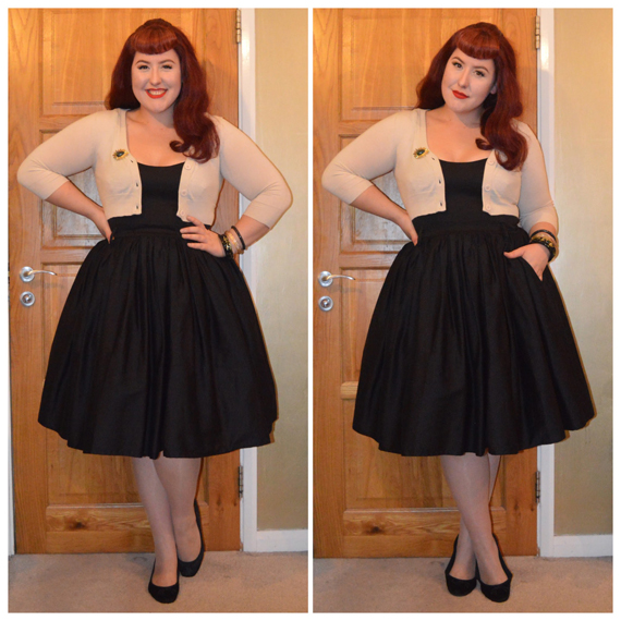 Black Jade dress by Collectif, Vintage brooch, Taupe Tootsie Cropped Cardigan from Doll Me Up, New Look black flats, Bow and Crossbones Gold Thread bangles, Splendette black bangles