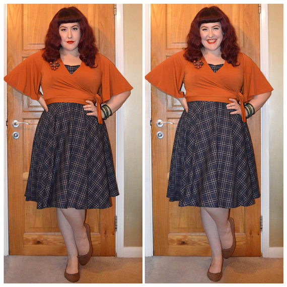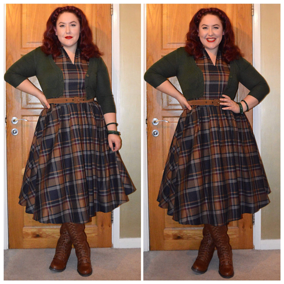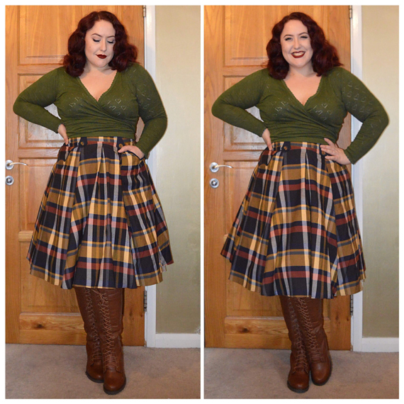 Ivory Darcy wrap cardigan by Collectif dyed Dylon Olive Green, Tiffany-Lee skirt by Miss Candyfloss, Cognac Cecily boots by JustFab (referral link here for money off)