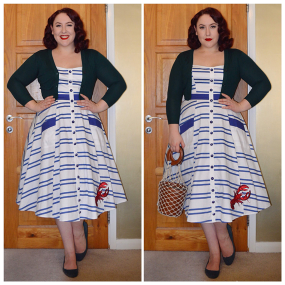 Striped Lobster Sangrine dress by Collectif, Amazon cardigan, Fishnet bucket bag from eBay, old H&M shoes