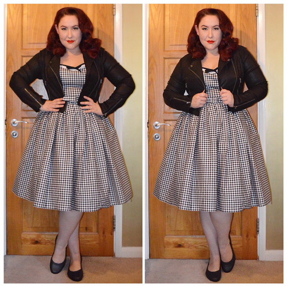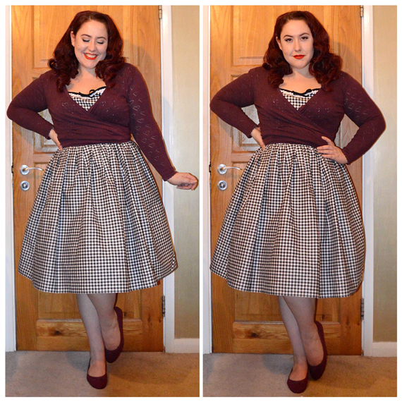 Black Bardot gingham dress by Vixen by Micheline Pitt bought from Deadly is the Female, Ivory Darcy wrap cardigan by Collectif dyed Dylon Burlesque Red, old New Look flats, Irresistible Me Rosewood 99J full lace human hair wig worn as a half wig