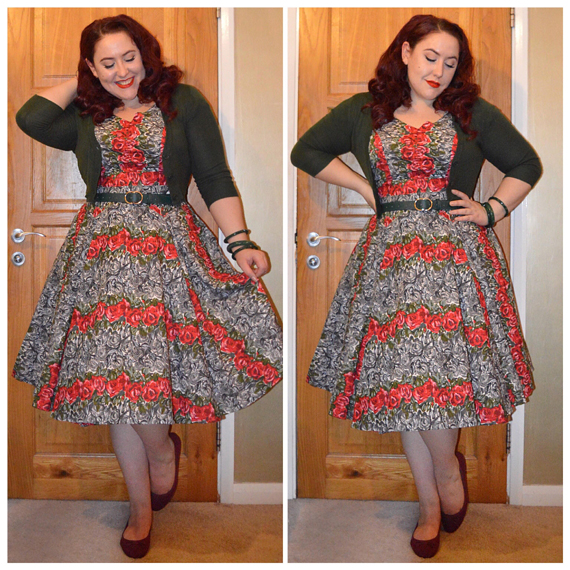 1950s Rose Belt dress by LoveURLook, Hunter Green Tootsie Cropped Cardigan from DMU, Green Circle belt by New Look, old New Look flats, Irresistible Me Rosewood 99J full lace human hair wig worn as a half wig