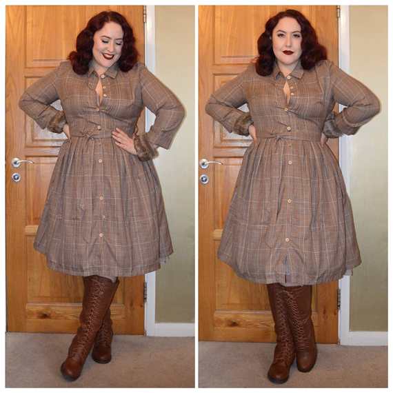 Charlotte dress by Lindybop, removable faux fur cuffs from eBay, Cognac Cecily boots by Justfab (referral link here for money off)