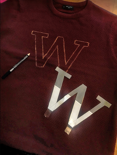 I wanted the initial on my jumper to be a W for Weasley, because I’ve never really liked the idea of sporting an ‘A’ for my own name on anything I own. With my jumper in hand, I had to figure out how I was going to produce that W on the jumper. I knew I couldn’t freehand it, and searching online for large letter stencils produced nothing useful. In the end I decided to type a large W in a word document and print it off onto paper to cut out to form my own stencil.