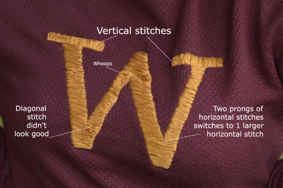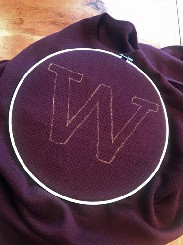 Here’s where my lack of experience embroidering is going to make serious hobbyists cringe. There is a right way to embroider (I can only assume) which I did not do (pretty sure about that, kind of don’t even need to look it up to be sure.) The one thing I knew I had to be careful of was to make sure my stitches couldn’t accidentally be caught by stray pokey-objects when I was wearing the jumper, but since parts of my W would be about an inch wide, that was going to produce quite a large stitch that could potentially be snagged.