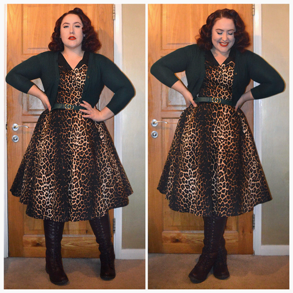 Panthera dress by Hell Bunny (discount code AMYMAY20!%,) cropped cardigan from Amazon, green circle belt from New Look, Burgundy Cecily boots by JustFab (referral link to get them for under £15)