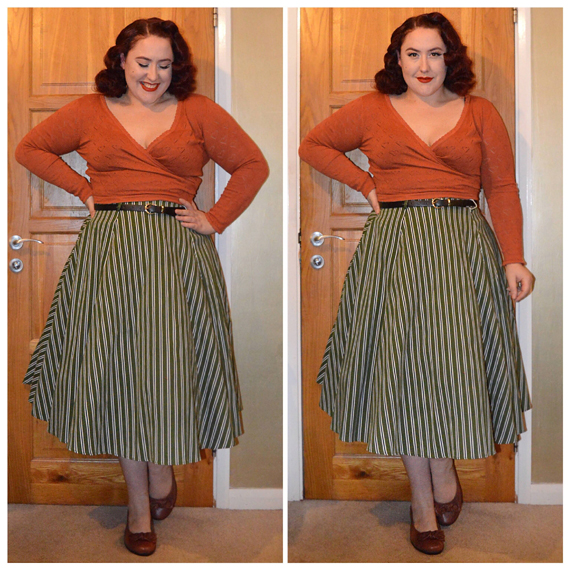 Ivory Darcy cardigan by Collectif dyed Terracotta Brown by Dylon, Olive striped Rosie skirt by Collectif, Chestnut Jewel shoes by Hotter