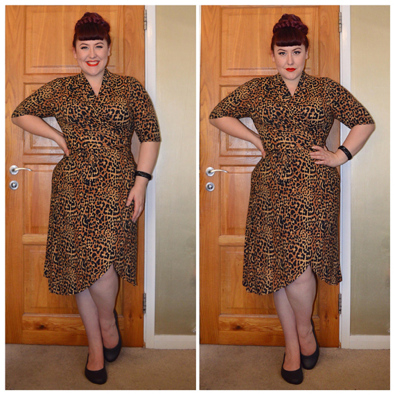 Lotta Leopard wrap dress by Joanie Clothing, At Work flats by Crocs, Black Splendette Bangle, clip-in fringe self-cut and coloured from eBay, faux plaits created using Deep Wine braiding bundles from eBay