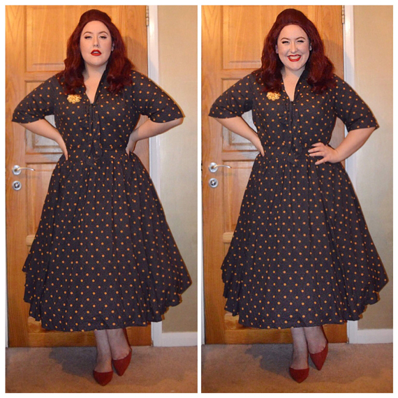 Tie-neck Polka dot dress by eShakti (Referral code AMYHARMAN for $35 off first purchase,) vintage brooch, rust flats by Primark, Full lace human hair wig in Rosewood 99J by Irresistible Me