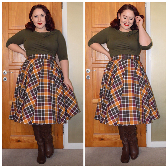 Olive Lily top by Heart of Haute, Fall Flannel circle skirt by Heart of Haute bought from Doll Me Up, Dark Brown Keira buckle boots by JustFab (referral link to grab them for under £15)