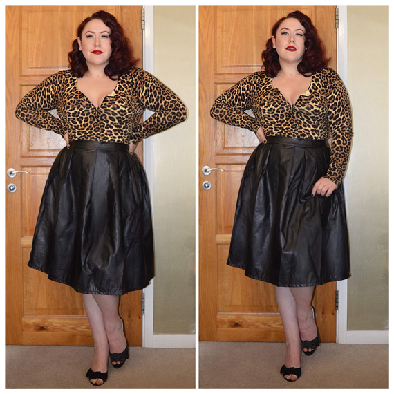 Crazy Love leopard cardigan by Banned/Dancing Days. Faux Leather box pleat skirt by Boohoo, Black Joyce heels by Lindy Bop