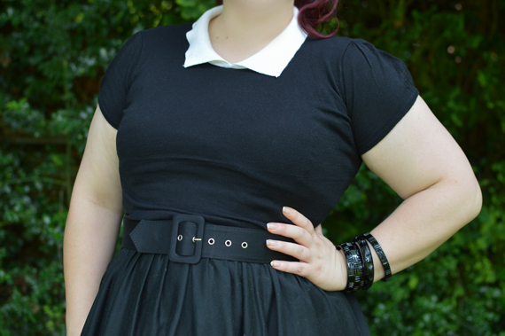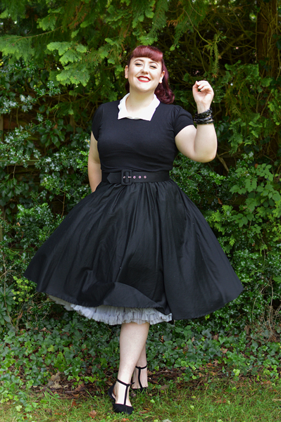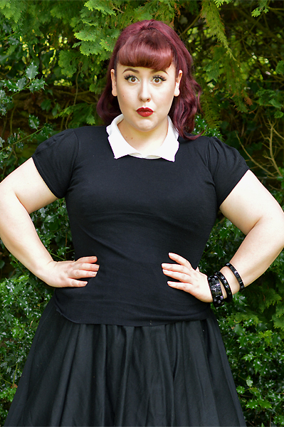 The collared sweaters aren’t a brand new style, as they’ve been available for at least a year, but a lot of the colours are currently included in MAK’s blow out sale section so if you’ve ever been tempted to try one then now’s the time. (Using my discount code means they only cost $9.90 each!) It comes in 10 plain colour combinations and 7 polka dot colourways, all in sizes S-L. As they’re made from the same fine knit as the cropped cardigans, though, there’s tons of stretch in the material, enough that even the size L I’m wearing above accommodated my 46 inch bust without strain or any visible sheerness appearing in the fabric.