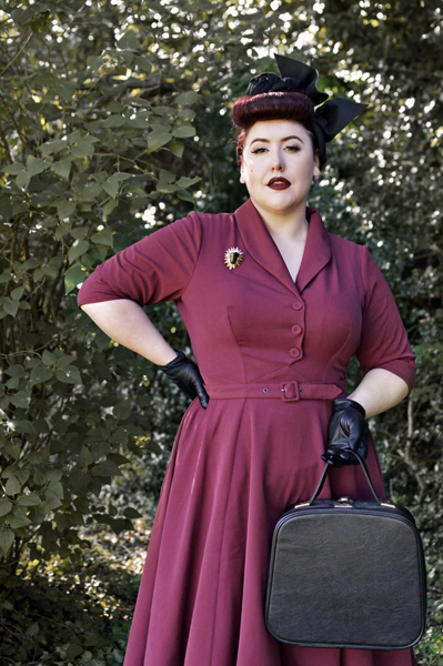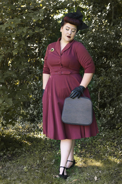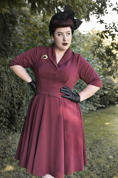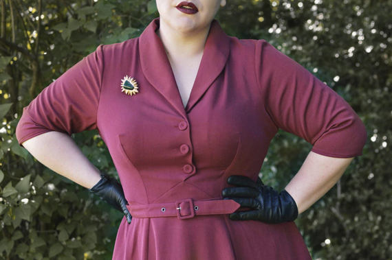 It has a hidden side zip and pleats in the back of the skirt. Said skirt is flared to fit a medium volume petticoat elegantly or drape beautifully without one, while the half sleeves offer warmth and refinement. This dress can be worn at work or to dinner, in church or to a winter wedding, for a day about town or even to travel in style. It’s simplicity allows you to experiment with its styling, suited to layering up rich tones of all colours to compliment its lovely burgundy shade.