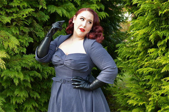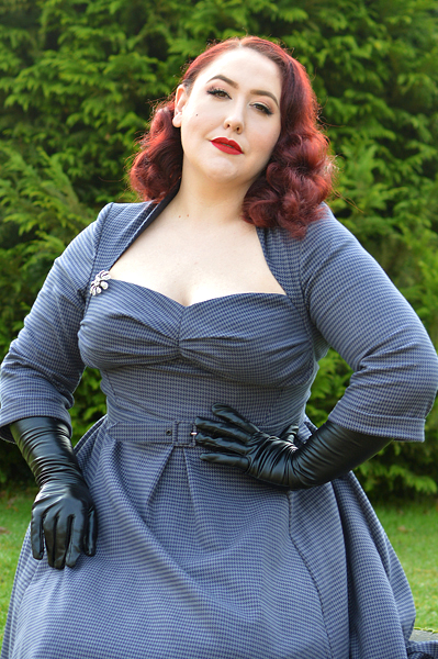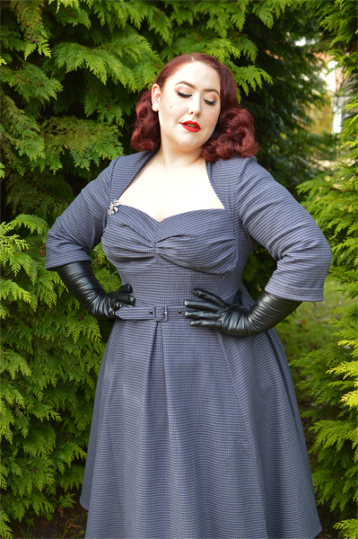 This dress was inspired by the blue wiggle dress worn by Marilyn in Gentlemen Prefer Blondes, that of the sassy upstanding pointed collar and dramatic arrow-frame neckline. It’s the neckline of this Bombshell swing dress that so captured me upon first glimpse, the way it so lovingly frames the decolletage and the flattering gathers in the cups. It might even look to a more modern eye that one is wearing a matching bolero with a strapless dress, but no, it is one beautifully designed marvel. The fact that the stunning shape of this dress is paired with the gorgeous muted grey-blue houndstooth fabric it’s made in only elevated my adoration, as houndstooth is a print I feel is underused in the reproduction and vintage-inspired world. And that romantic, hazy blue? Augh, just lay me to rest now.