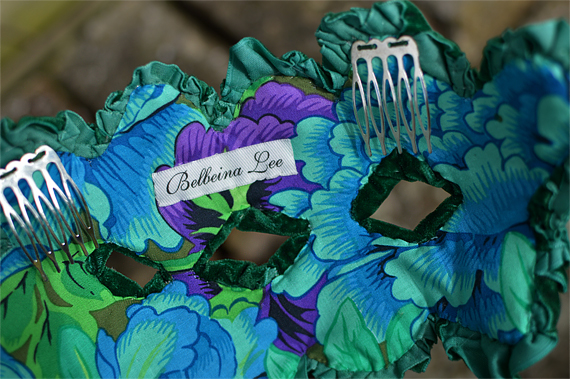 The Ella cap is made of soft velvet ribbons lovingly stitched into place upon a wired base to create the leaf-like folds and shape. The full wiring of the piecemeans it can be moulded to perfectly sit upon your head just the way you want it for the best placement for your hairdo and the most secure fit. The underside of the piece features a lovely purple, blue and green floral print fabric, Belbeina Lee’s branded label hand stitched in place, and two totally secure small metal combs.