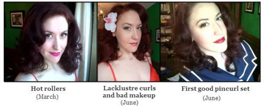 My hair experimentation continued–I learned, very early on (although not early enough for my present-day liking, cringe) that victory rolls are not a vintage necessity nor are they suited to me, which is a small blessing really because I still can’t do them properly. Over time I learned that finding the right setting lotion can make all the difference in the softness, hold and ease of brushing out a wetset (Motions At Home Foaming Wrap is what I use, in case you’re wondering.) I learned a smoothing brush is crucial in achieving a sleek, smooth brush out, so grab yourself a Denman bristle brush. I learned that hand-rolling pincurls doesn’t make you a better pinup than someone who uses foam rollers, but they probably do give you a different result and most pinups will find the one thing they like and stick to it.