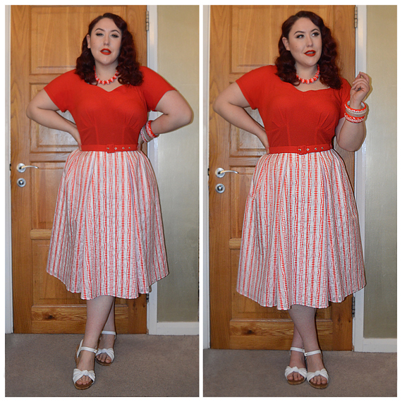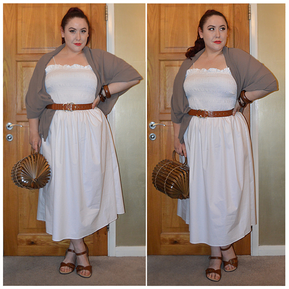 Late July – In the thick of another heatwave I saw my besties outside at Ju’s again. I’d recently been pining for a white strappy swing dress with a full skirt but my budget was tight. There was nothing available that fit my requirements in the vintage realm so I ordered this stretchy piece from H&M (I didn’t even know they had expanded their plus sizes beyond the size-16-that-was-really-a-size-14 limit I had experienced the last time I had shopped with them probably 8+ years ago.) It’s lightweight and very stretchy, so it made for a great piece to wear when wearing anything at all feels like a hot affront, and taking a shawl in case the weather dipped felt like a good back up plan. Considering I usually don’t feel comfortable dressed ‘normally,’ I was really pleased with this outfit, and felt both stylish and comfy in the heat, but my god did people fucking hate this outfit when I put it on Instagram. Usually when I (and most Instagrammers, to be fair) post a look on IG that is way outside of the norm it gets much more engagement and excitement than my usual content, but I guess wearing less makeup and a comfortable dress during a heatwave is where that line gets drawn on vintage social media (in a message I’d put the crying laughing emoji here, just so you know.) Well, I still like this outfit and I can totally see this as one way I might lean if I ever get sick of dressing vintage inspired, but for now it makes for a good option when it’s hot as balls.