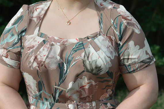 Getting further into specifics, the Varvara dress is a modest piece, cut in a sweetheart neckline so subtle it almost appears straight. The sleeves have a darling little detail that may be easy to overlook at first glance, but are refreshingly unique, featuring folded over cuffs which sport 3 tiny pleats at their edge. There are 3 pleats on either side of the bust too, and box pleats in the skirt, which holds bigger pockets than I’ve ever noticed on my other Miss Candyfloss dresses —always huzzah! Pockets can never be too big, as far as I’m concerned (she says, after recently inserting comically small pockets into the first dress she’s ever made. Whoops.)