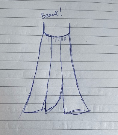 Full of pride and smug in my clearly superb skill—because HELLO, I had French Seamed this sucker—I went to try it on for the first time before attaching straps, only to find that, uh oh, putting it on over my head meant I was getting stuck around the elbows. I was unwilling to eat the cost of the (admittedly inexpensive) fabric, especially since it was really hot and I needed a nighty, so I decided I’d have to cut it in half straight down the middle and insert a panel at the front and the back. Problem was, I had only bought 1 metre of fabric. I had mostly unusable scraps leftover that would not make panels that were the same length as the nighty. Sooo, ya girl now owns a French seamed floral print cotton nighty that has full Frankenstein’s monster vibes, because the thigh area at the front has a slit on each side, one side of which is curved along one edge, because there wasn’t enough straight fabric left, and at the back there is only a teeny tiny slit on one side, again, because the fabric wasn’t quite wide enough for the full length. Please enjoy my exquisitely hand drawn depiction of my comfortable monstrosity, above.