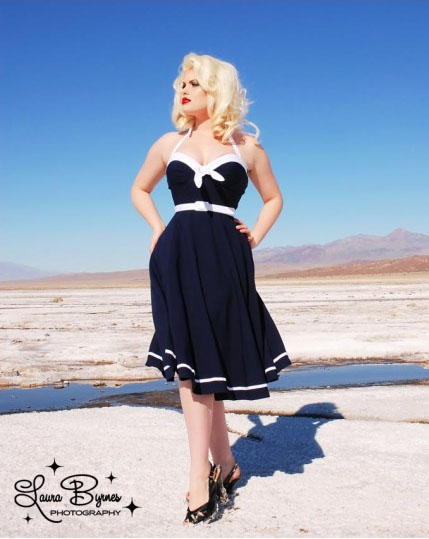 We don’t want to taunt you too much with this dress because unfortunately it’s now out of stock after going on super sale at $60 down from $160–yeah, no wonder that bad girl sold out, and fast. (Such a sale is part of the Pinup Girl Clothing Online Yard Sale, where no item is over $60 and the sale section is updated regularly.) So while we’d like to focus a little on the dress and it’s fit to give you PUG newbies an idea of the brand’s quality, we want to focus as well on the parts of us that aren’t so similar; our differing sizes, shapes, colouring and styles.